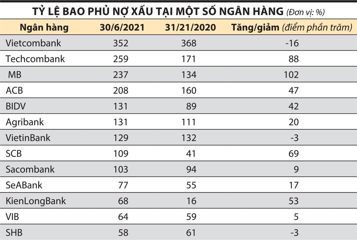 Đáng lưu ý, có 11 ngân hàng đưa tỷ lệ bao phủ nợ xấu lên trên 100%, thậm chí một số nhà băng đạt 200 - 300%. Vietcombank đang là quán quân về tỷ lệ bao phủ nợ xấu tính đến 30/6/2021, đạt 352%, tức cứ 100 đồng nợ xấu thì nhà băng này dự phòng 352 đồng.