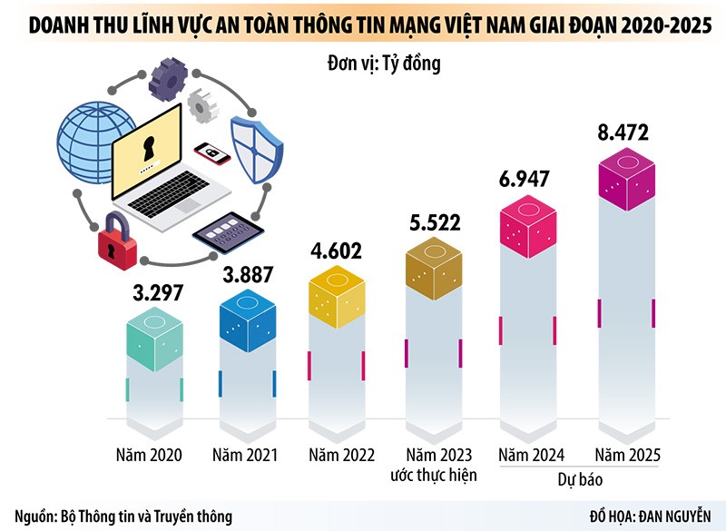 Đó sẽ là cơ hội lớn cho doanh nghiệp Việt Nam gia nhập thị trường cung ứng giải pháp an ninh, bảo mật cho nước ngoài. Năm 2023, doanh thu lĩnh vực an toàn thông tin mạng của Việt Nam đạt 5.522 tỷ đồng, tăng 20% so với năm 2022. Số doanh nghiệp hoạt động trong lĩnh vực này cũng không ngừng tăng lên. Đến nay, có 109 doanh nghiệp được cấp phép (3 tập đoàn nhà nước, 69 công ty cổ phần và 34 công ty trách nhiệm hữu hạn). Trong đó, 74 doanh nghiệp được cấp phép nhập khẩu sản phẩm, 30 doanh nghiệp được cấp phép sản xuất sản phẩm và 80 doanh nghiệp được cấp phép cung cấp dịch vụ.