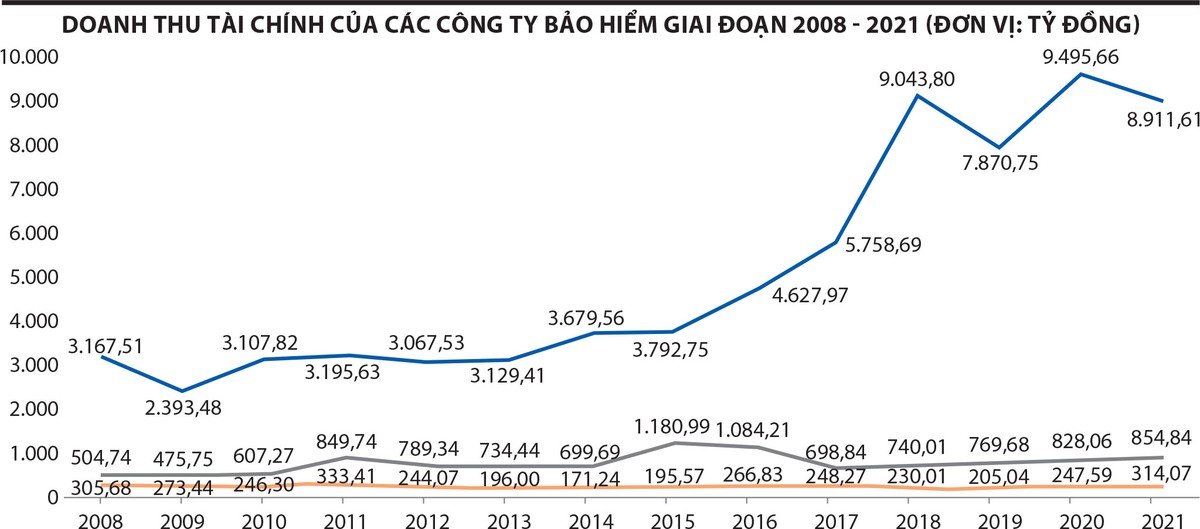 Xét doanh thu tài chính (chủ yếu là lãi tiền gửi ngân hàng) của 3 doanh nghiệp bảo hiểm điển hình là Bảo Việt, Bảo Minh và PVI, doanh thu này có xu hướng tăng từ năm 2009 đến năm 2011, trùng với thời điểm lãi suất trong nước tăng lên. Tuy nhiên, tới giai đoạn lãi suất giảm năm 2012 - 2015, doanh thu tài chính của nhóm doanh nghiệp bảo hiểm chững lại và bước sang giai đoạn 2017 - 2019 thì tăng trở lại.