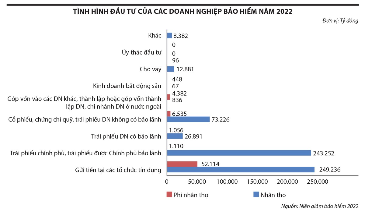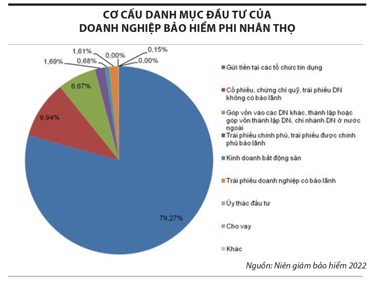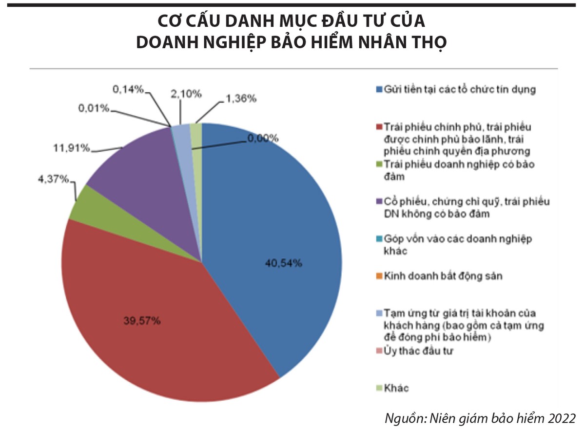Theo Cục Quản lý, giám sát bảo hiểm, Bộ Tài chính, hoạt động đầu tư của các doanh nghiệp bảo hiểm hiện khá đa dạng, gồm góp vốn thành lập doanh nghiệp khác; cho vay; đầu tư trái phiếu chính phủ, cổ phiếu; gửi tiền tại các tổ chức tín dụng. Năm 2022, danh mục đầu tư của các doanh nghiệp bảo hiểm được phân bổ như sau: tiền gửi tại các tổ chức tín dụng chiếm 44,28%; trái phiếu chính phủ, trái phiếu được Chính phủ bảo lãnh và trái phiếu chính quyền địa phương chiếm 35,91%.