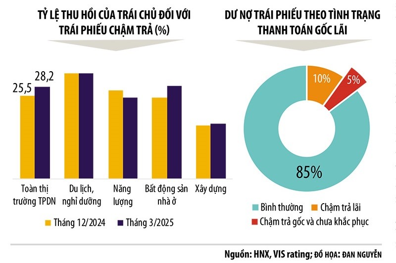 Trong số trái phiếu có vấn đề, 63,4% giá trị đến từ nhóm bất động sản. Các doanh nghiệp này đã có loạt lô trái phiếu doanh nghiệp giãn hoãn thời gian thanh toán trước đó và vẫn còn nghĩa vụ nợ đáo hạn lớn trong 12 tháng tới. Việc này báo hiệu tình trạng chậm trả/giãn hoãn tiếp tục trong năm 2025 đối với nhóm trên.