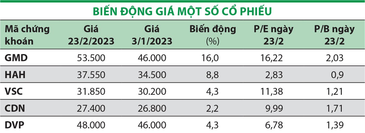 Với Công ty cổ phần Vận tải và Xếp dỡ Hải An (Hải An, mã chứng khoán HAH), năm 2023, Công ty dự kiến đạt doanh thu 2.698 tỷ đồng, lợi nhuận sau thuế công ty mẹ 300 tỷ đồng, lần lượt giảm 16% và 64% so với năm 2022 (năm 2022, Công ty đạt doanh thu 3.205 tỷ đồng, lợi nhuận sau thuế 821 tỷ đồng, lần lượt tăng 63,9% và 84,4% so với năm 2021).