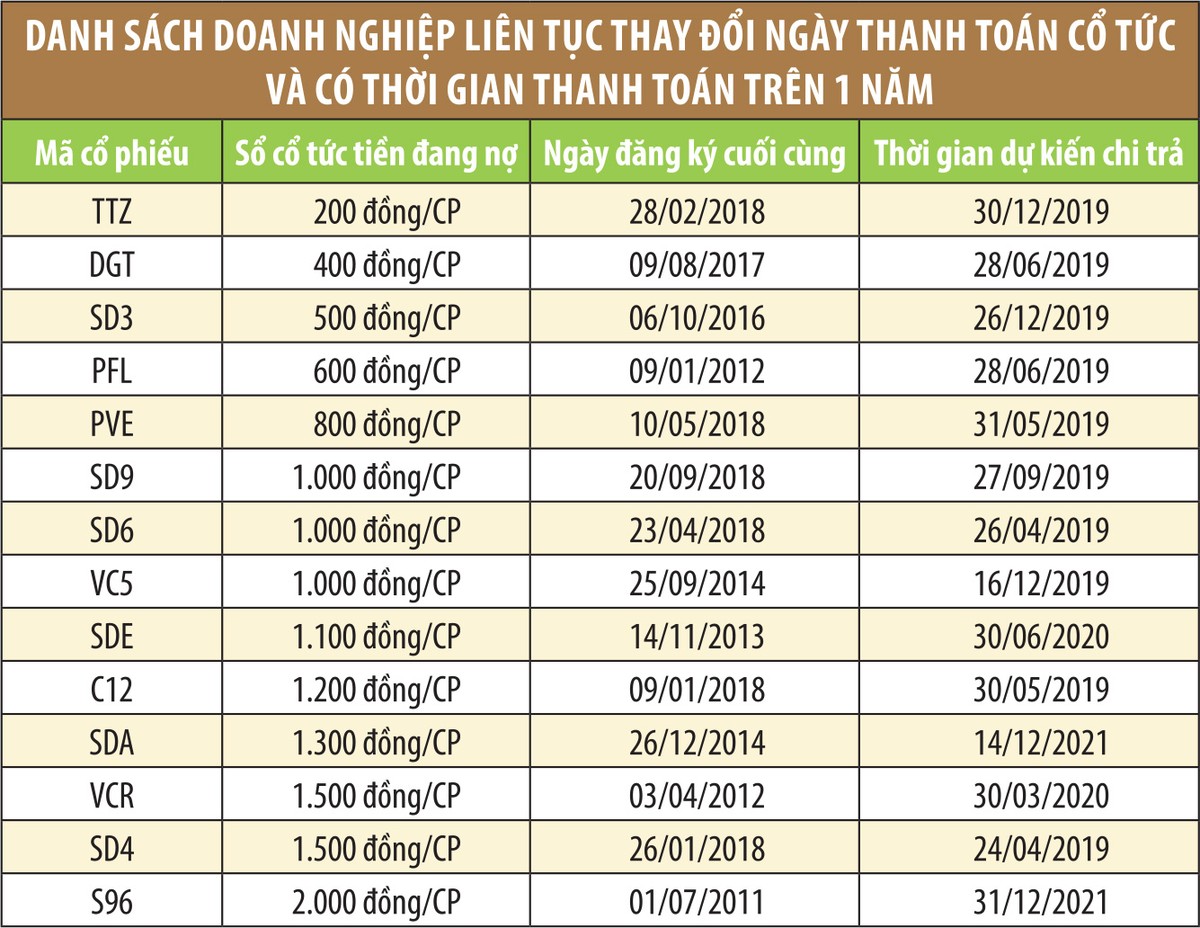 Hay CTCP Xây dựng số 5 (VC5) có tới 7 lần điều chỉnh thời gian thanh toán khoản cổ tức 1.000 đồng/cổ phiếu sau khi chốt quyền vào tháng 10/2014. Thời gian dự kiến thanh toán trong lần điều chỉnh gần nhất là ngày 16/12/2019.