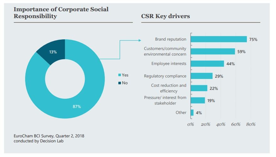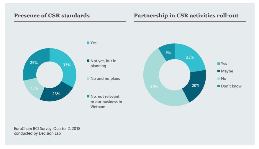 CSR được các doanh nghiệp áp dụng phổ biến như một phương tiện để đạt được những tác động tích cực đến xã hội. 87% lãnh đạo doanh nghiệp châu Âu tham gia khảo sát BCI của EuroCham đồng ý rằng, hoạt động CSR là quan trọng đối với hoạt động kinh doanh của họ tại Việt Nam.