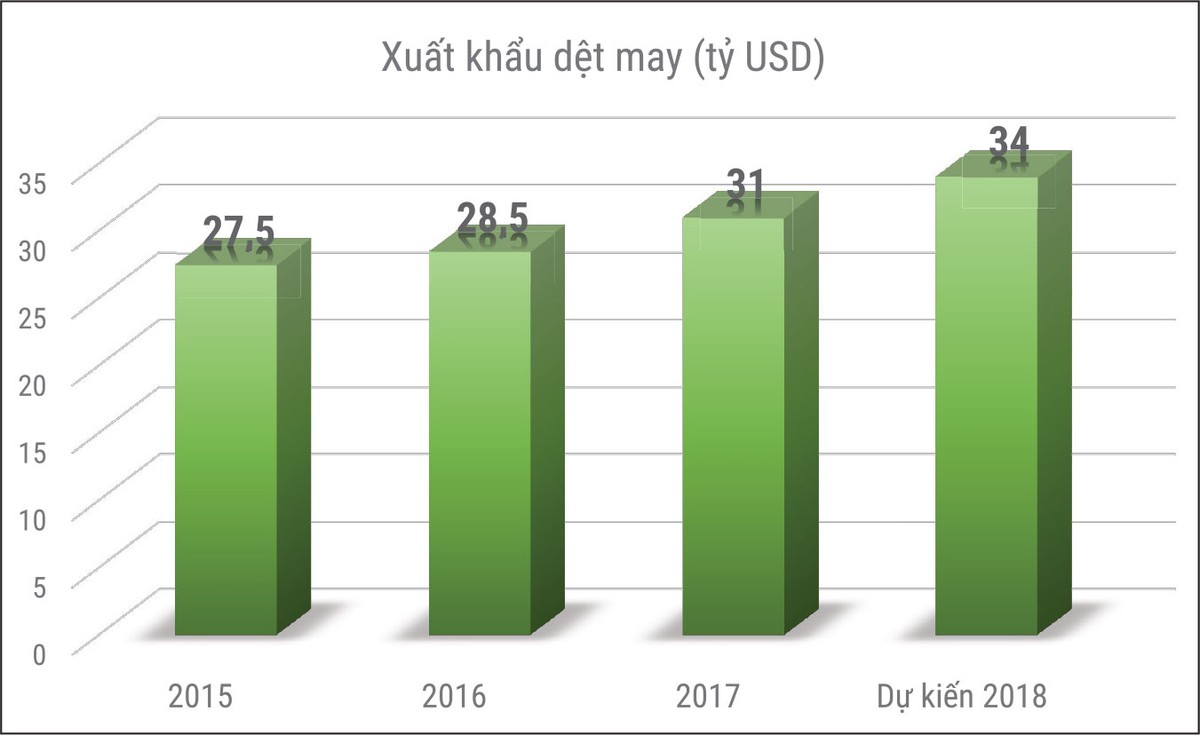 "Năm 2017, ngành dệt may đã khá thành công khi đem về 31 tỷ USD (tăng trưởng 10,23%). Trong năm 2018, con số này được kỳ vọng sẽ tăng thêm 3 tỷ USD", ông Cẩm nói.