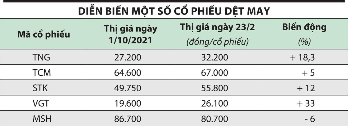 Trên thị trường chứng khoán, TCM, TNG, STK, VGT, MSH… là nhóm cổ phiếu được ưa thích khi nhắc đến ngành dệt may. Các cổ phiếu này đã có đà tăng mạnh mẽ trong thời gian qua. Tính đến ngày 23/2/2022, TNG có thị giá 32.200 đồng/cổ phiếu, tăng 18,3% so với thời điểm 1/10/2021 (thời điểm bắt đầu trạng thái “bình thường mới”). Cùng thời gian này, cổ phiếu TCM tăng 5%, STK tăng 12%, VGT tăng 32%...