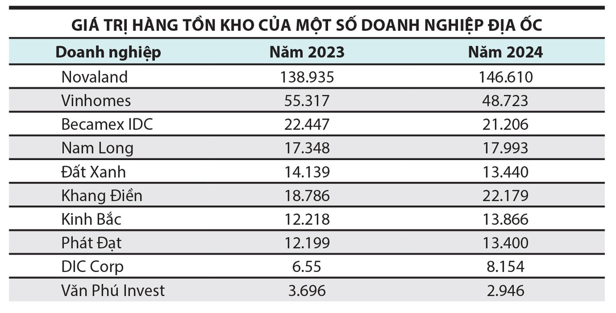 Số liệu tổng hợp từ báo cáo tài chính của 130 doanh nghiệp địa ốc đang niêm yết, giao dịch cổ phiếu trên sàn chứng khoán cho thấy, tại thời điểm cuối năm 2024, tổng lượng hàng tồn kho bất động sản vào khoảng hơn 462.700 tỷ đồng, tăng hơn 10.000 tỷ đồng so với cuối năm 2023. Tồn kho tập trung chủ yếu ở các doanh nghiệp lớn như Novaland, Vinhomes, Becamex IDC, Nam Long, Đất Xanh, Khang Điền, Kinh Bắc, Phát Đạt, DIC Corp và Văn Phú Invest, với tổng giá trị đạt hơn 308.000 tỷ đồng.