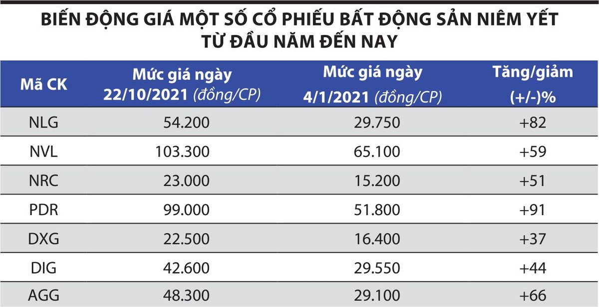 Đơn cử, cổ phiếu NLG của Nam Long Group ghi nhận mức tăng ấn tượng từ đầu năm đến nay, khi đóng cửa phiên giao dịch ngày 22/10/2021 ở mức giá 54.200 đồng/cổ phiếu, tăng hơn 82% so với mức giá 29.750 đồng/cổ phiếu ngày 4/1/2021. Tương tự, cổ phiếu AGG của Bất động sản An Gia cũng tăng gần 66%, từ mức 29.100 đồng/cổ phiếu ngày 4/1/2021 lên mức 48.300 đồng/cổ phiếu ngày 22/10/2021.