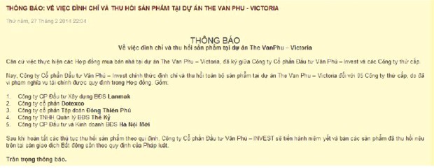 Trong thông báo mới nhất về đình chỉ và thu hồi sản phẩm Dự án Văn Phú - Victoria, có tới 5 công ty thứ cấp bị chấm dứt hợp đồng