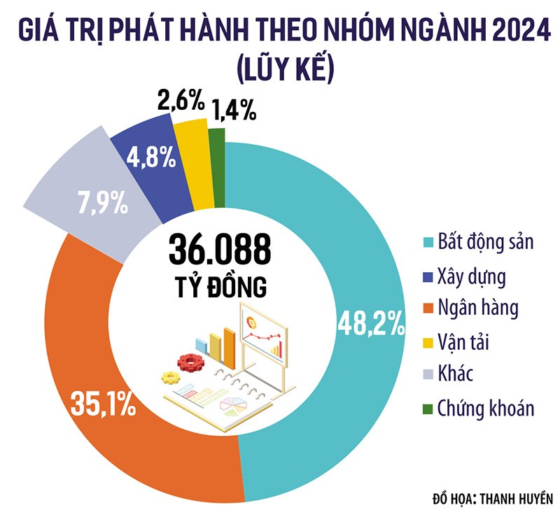 Không chỉ doanh nghiệp bất động sản, mà doanh nghiệp xây dựng cũng rầm rộ phát hành trái phiếu trở lại. Trong quý I/2024, giá trị phát hành trái phiếu doanh nghiệp ngành xây dựng và vật liệu xây dựng tăng cao gấp 2,6 lần cả năm 2023.