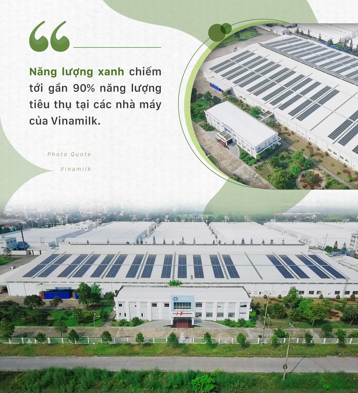 Tại Vinamilk, việc đầu tư hệ thống năng lượng tái tạo được chú trọng từ nhiều năm trước. Theo định hướng bảo vệ nguồn năng lượng và giảm khí thải gây hiệu ứng nhà kính, Vinamilk chuyển sang sử dụng các nguồn năng lượng sạch như năng lượng mặt trời, khí CNG, Biogas và Biomass thay thế cho năng lượng truyền thống như điện, dầu FO, DO. Đến nay, năng lượng xanh đạt khoảng 90% nguồn năng lượng tiêu thụ tại các nhà máy Vinamilk.