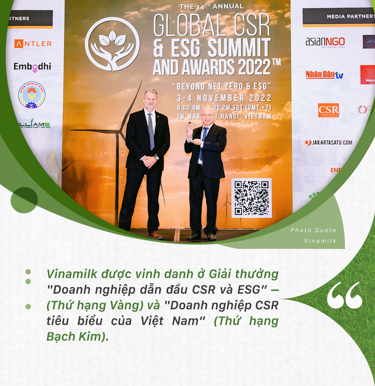 Mới đây, Vinamilk được Ban tổ chức Giải thưởng CSR & ESG toàn cầu vinh danh với 2 hạng mục "Doanh nghiệp dẫn đầu CSR và ESG” – (Thứ hạng Vàng) và "Doanh nghiệp CSR tiêu biểu của Việt Nam” (Thứ hạng Bạch Kim). Điều này cũng cho thấy sự ghi nhận của cộng đồng quốc tế về những nỗ lực và hành động tích cực của Vinamilk trong tiến trình thúc đẩy đầu tư ESG và CSR (Trách nhiệm xã hội của doanh nghiệp).