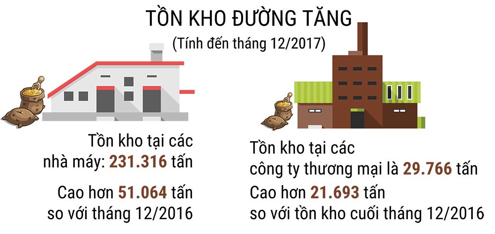 Ghi nhận tại nhà sản xuất đường số 1 Việt Nam là Công ty cổ phần Mía đường Thành Thành Công - Tây Ninh (SBT), lượng đường tồn kho cũng tăng mạnh. Tính đến cuối năm 2017, lượng hàng tồn kho tại Công ty đạt 1.956 tỷ đồng, tăng hơn 620 tỷ đồng so với thời điểm đầu năm. Trong đó, riêng đường thành phẩm tăng gần 560 tỷ đồng, lượng tồn kho nguyên liệu tăng 120 tỷ đồng.