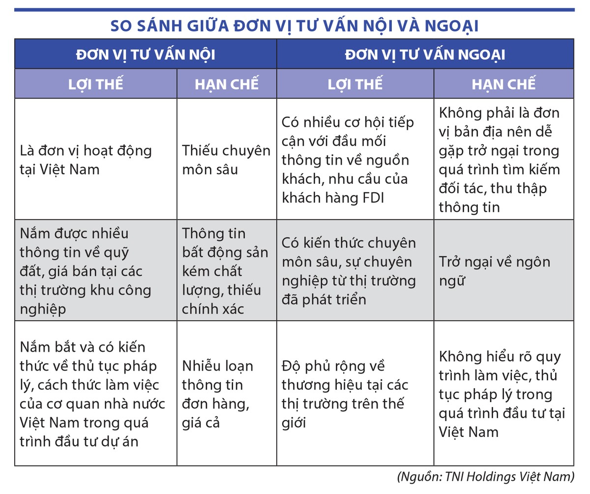 Nhìn trên bình diện toàn thị trường, sự tham gia của các doanh nghiệp môi giới nội trong mảng bất động sản công nghiệp còn rất hạn chế. Quan sát diễn biến mảng hoạt động này, ông Vũ Công Trụ, chuyên gia kinh doanh bất động sản công nghiệp và xúc tiến đầu tư FDI cho rằng, với những yêu cầu cao trong việc tư vấn cho khách thuê, số lượng doanh nghiệp tư vấn trong nước đủ khả năng đáp ứng được toàn bộ các công đoạn liên quan tới tư vấn là không nhiều, mà chủ yếu là hợp tác với nhau hoặc hợp tác với các đơn vị tư vấn nước ngoài, trong đó mỗi bên sẽ tập trung vào những công đoạn mà mình có thế mạnh.