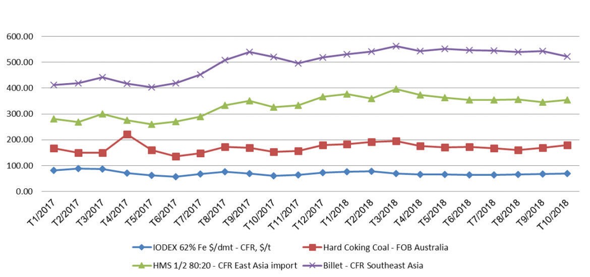 Nhu cầu quặng sắt trên thị trường tiếp tục tăng cao. Giá quặng sắt loại 62% FE ngày 7/10 ở mức 69 - 70 USD/tấn CFR cảng Thiên Tân, Trung Quốc, tăng khoảng 7 USD/tấn so với đầu tháng 7/2018. Giá than hiện khoảng 17.500 - 18.000 USD/tấn. Các nguyên liệu sản xuất thép khác có diễn biến giá đi ngang trong quý III/2018, trước đó có xu hướng tăng kể từ tháng 4/2017.