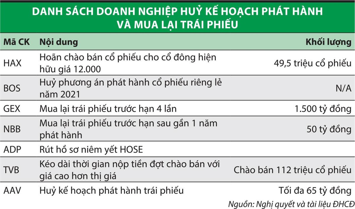 Trên sàn, một số công ty niêm yết hoãn kế hoạch phát hành cổ phiếu, trái phiếu và mua lại trái phiếu trước hạn. Cụ thể, CTCP Dịch vụ ô tô Hàng Xanh (Haxaco, mã HAX) tạm hoãn kế hoạch chào bán 49,5 triệu cổ phiếu cho cổ đông hiện hữu với lý do diễn biến của thị trường không tốt, ảnh hưởng đến lợi ích của công ty và lợi ích của cổ đông.