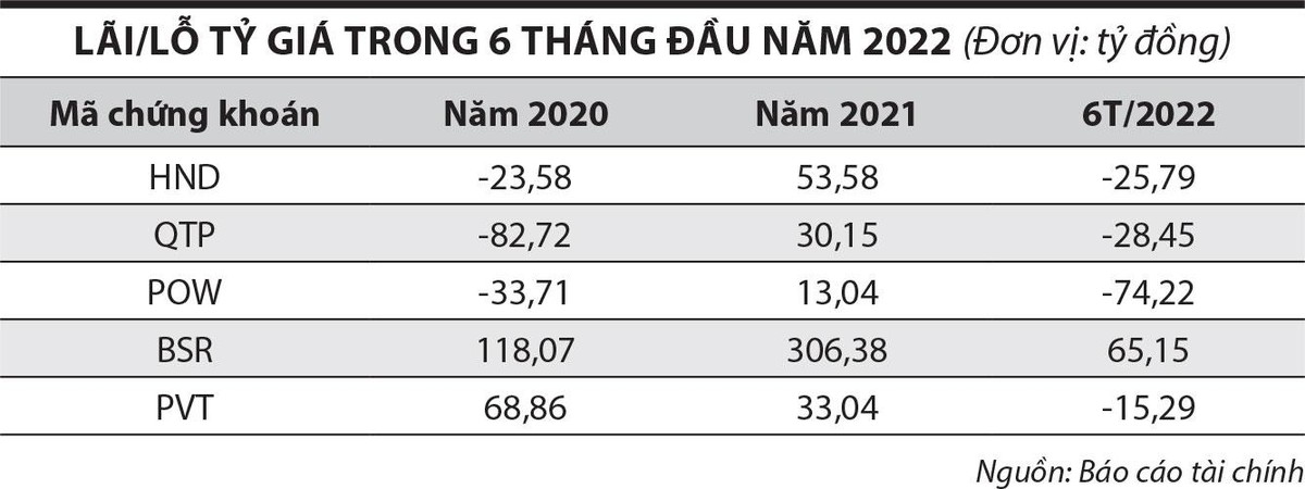 Cụ thể, trong 6 tháng đầu năm 2022, mức lỗ tỷ giá của Công ty cổ phần Nhiệt điện Hải Phòng (mã chứng khoán HND) là 25,8 tỷ đồng, Công ty cổ phần Nhiệt điện Quảng Ninh (mã chứng khoán QTP) là 28,4 tỷ đồng, Tổng công ty Điện lực Dầu khí Việt Nam - CTCP (PV Power, mã chứng khoán POW) lỗ 74,2 tỷ đồng...