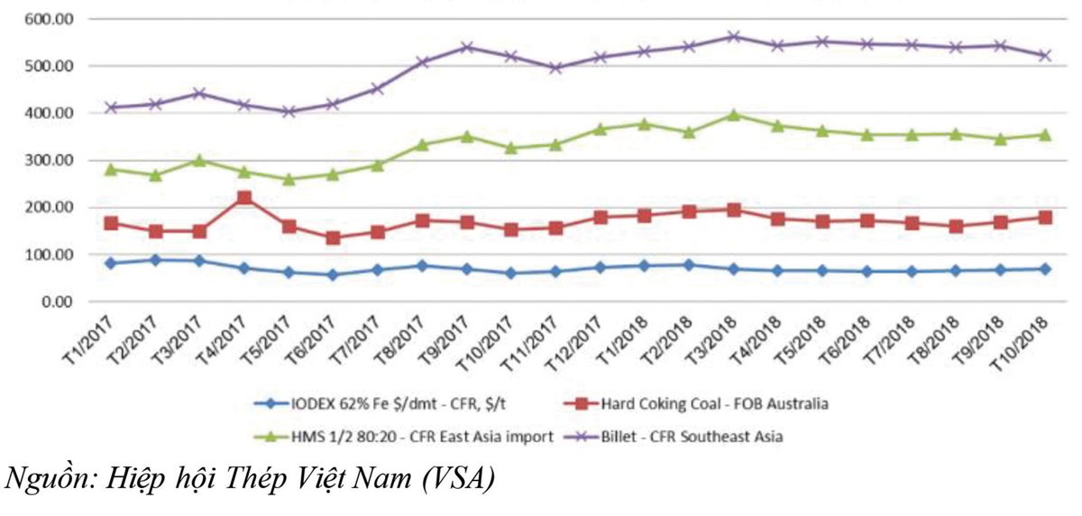 Diễn biến giá nguyên liệu sản xuất thép từ Tháng 1/2017 đến Tháng10/2018.