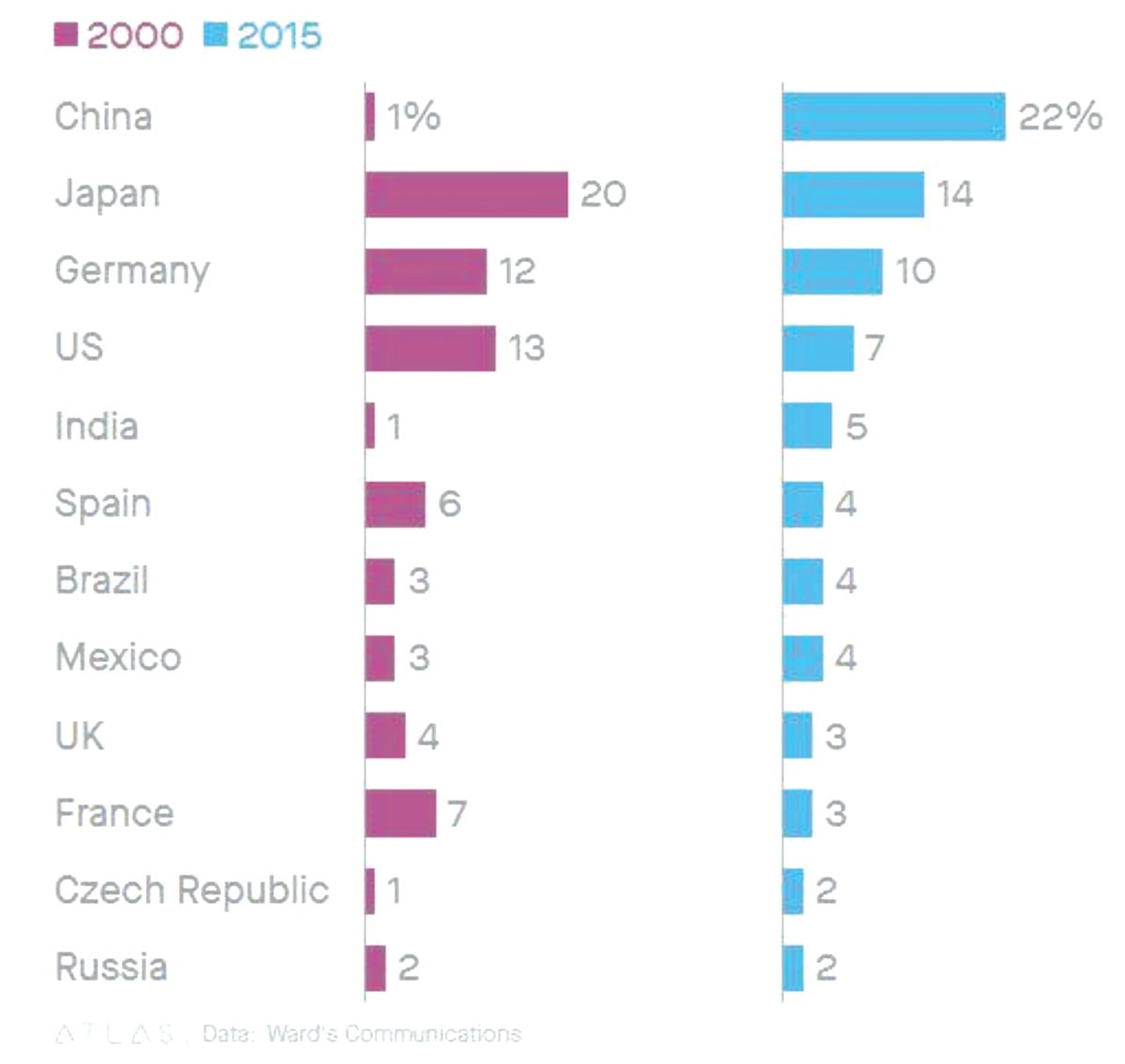 Kể từ năm 2005, thị phần xe hơi và xe tải Mỹ đã giảm gần một nửa. Năm 2015, xe Mỹ chỉ còn chiếm 7% xe hơi và 22% xe tải được bán ra trên toàn cầu. Đáng chú ý, với việc người tiêu dùng trên thế giới có nhiều sự lựa chọn như hiện tại, các doanh nghiệp xe Mỹ hoặc phải có sức cạnh tranh lớn hơn bao giờ hết trên sân chơi toàn cầu, hoặc phải co cụm về thị trường nội địa nhỏ bé hơn, tù đọng hơn.