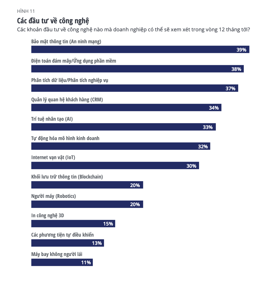 Bên cạnh việc chuyển động với tốc độ nhanh hơn, các tổ chức tham gia khảo sát cũng đang tăng cường quy mô đầu tư vào công nghệ. Bảo mật thông tin dự kiến sẽ là khoản đầu tư về khoa học công nghệ cao nhất trong vòng 12 tháng tới, sau đó là điện toán đám mây, phân tích dữ liệu, quản lý quan hệ khách hàng (CRM)…