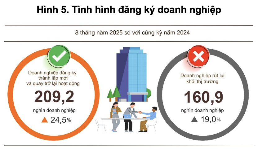 Trong kỳ, còn có 81.100 doanh nghiệp quay trở lại hoạt động, tăng 41,4%, nâng tổng số doanh nghiệp thành lập mới và quay trở lại hoạt động trong 8 tháng lên 209.200 doanh nghiệp, tăng 24,5%. Bình quân mỗi tháng có 26.200 doanh nghiệp gia nhập thị trường.