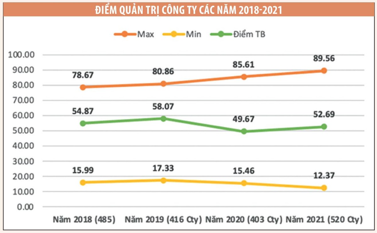 Điểm số cao nhất liên tục tăng lên qua các năm mặc dù bộ tiêu chí quản trị công ty có độ khó thay đổi, với doanh nghiệp có điểm cao nhất đạt điểm 89,56, cho thấy có những doanh nghiệp niêm yết có ban lãnh đạo công ty luôn chú trọng áp dụng các thông lệ quản trị tốt và liên tục cải thiện qua các năm, nhờ đó đạt được mức điểm cao hơn, cũng như liên tục xuất hiện trong các kỳ vinh danh quản trị tốt. Điểm trung bình năm 2021 tăng lên so với năm 2020, đạt 52,59 điểm. Tuy vậy, năm 2021 ghi nhận mức điểm thấp nhất trong mẫu khảo sát có giảm so với năm 2020 (do năm 2021 xuất hiện 2 công ty điểm thấp nhất là 12,37 điểm), vì lý do có nhiều doanh nghiệp mới lần đầu tiên được đưa vào đánh giá.