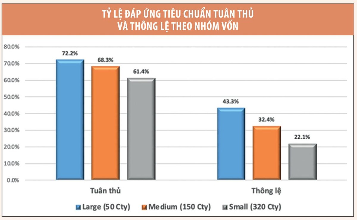 Bộ tiêu chí Quản trị công ty đánh giá hai khía cạnh thực hành quản trị, một là tuân thủ các quy định luật pháp, hai là đáp ứng các thông lệ quản trị tốt vượt trên mức tuân thủ. Nhìn chung, doanh nghiệp đã đáp ứng tốt hơn các quy định luật pháp so với năm trước, với mức độ đáp ứng các yêu cầu tuân thủ là 64,4% so với 59,0% năm 2020. Tuy nhiên, điểm số đối với các yêu cầu thông lệ quản trị cao hơn mức luật định vẫn là khía cạnh thách thức, khi mà mức độ đáp ứng các tiêu chuẩn chỉ ở mức 27,1% và có phần giảm nhẹ so với năm 2020. Đáp ứng các thông lệ quản trị tốt vẫn là một thách thức lớn với doanh nghiệp niêm yết của Việt Nam hiện nay.