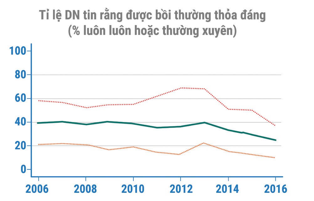 Cụ thể, năm 2016, tình hình sử dụng đất, theo đánh giá của doanh nghiệp trở nên bấp bênh hơn. Các doanh nghiệp tham gia điều tra cho biết, rủi ro bị thu hồi đất của họ ở mức cao kỷ lục (1,73 điểm, tương ứng với múc độ rủi ro rất cao). Kết quả PCI trong suốt 11 năm trước đó, chưa từng ghi nhận chỉ tiêu này ở mức thấp hơn 2 điểm. Thậm chí, trong trường hợp xấu nhất là nếu bị thu hồi, chỉ 25% doanh nghiệp tin tưởng sẽ được đền bù thỏa đáng, giảm mạnh so với các năm trước (30-40%).
