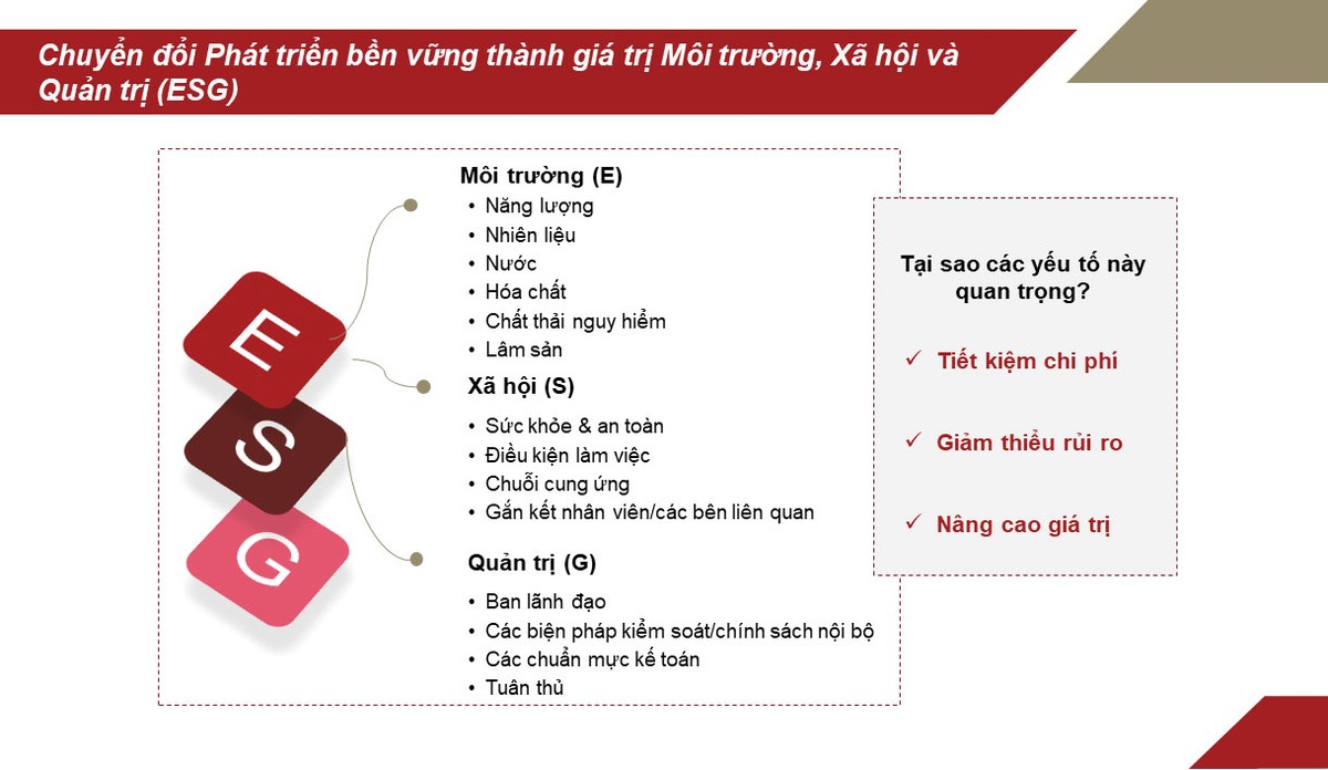 Những bộ tiêu chuẩn và chuẩn mực quốc tế này sẽ giúp cho doanh nghiệp đánh giá được trọng tâm, hiệu quả đầu tư, cũng như tạo lợi thế thu hút các nhà đầu tư tổ chức có trách nhiệm trên thế giới và tiến tới phát triển bền vững.
