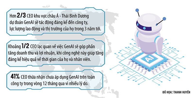 Trong nhóm các quốc gia, Australia dẫn đầu về áp dụng GenAI với tỷ lệ 63%, tiếp theo là Nhật Bản (50%), Ấn Độ và New Zealand (cả hai đều ở mức 39%). Tại Việt Nam, câu chuyện đầu tư theo trào lưu AI cũng đang nóng dần lên. Theo ông Bee Kheng, các công cụ GenAI đã mở ra những khả năng mới cho việc sáng tạo và đổi mới. Năm 2024, AI tiếp tục tăng tốc và trở thành yếu tố then chốt cho các doanh nghiệp Việt.