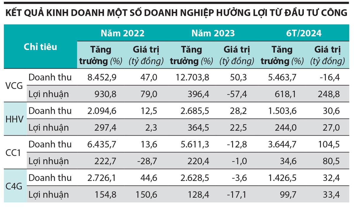 Tuy nhiên, các doanh nghiệp mở rộng hoạt động sang xây dựng dự án đầu tư công, xây dựng công nghiệp vẫn ghi nhận kết quả kinh doanh khả quan như Tổng công ty cổ phần Xuất nhập khẩu và Xây dựng Việt Nam (Vinaconex, mã VCG), Công ty cổ phần Đầu tư Hạ tầng Giao thông Đèo Cả (mã HHV), Tổng công ty Xây dựng số 1 - CTCP (mã CC1), Công ty cổ phần Tập đoàn Cienco 4 (mã C4G), Công ty cổ phần Xây dựng Coteccons (Coteccons, mã CTD).