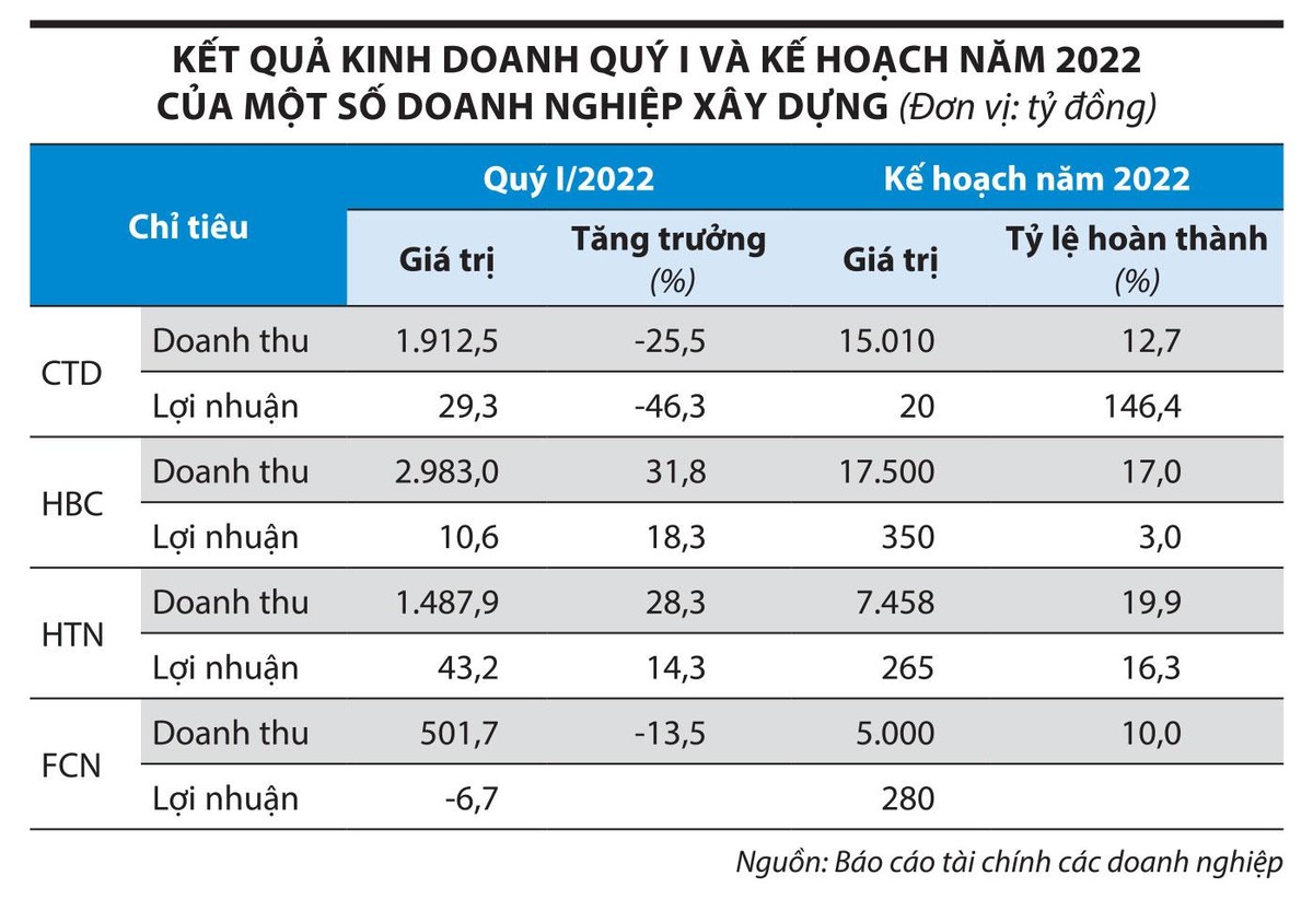 Trong quý I/2022, kết quả kinh doanh của 4 doanh nghiệp ngành xây dựng trên sàn chứng khoán có sự phân hóa (xem bảng), Hoà Bình và Hưng Thịnh Incons ghi nhận lợi nhuận tăng 18,3% và 14,3% so với cùng kỳ. Ngược lại, lợi nhuận của Coteccons sụt giảm, còn Fecon thua lỗ.