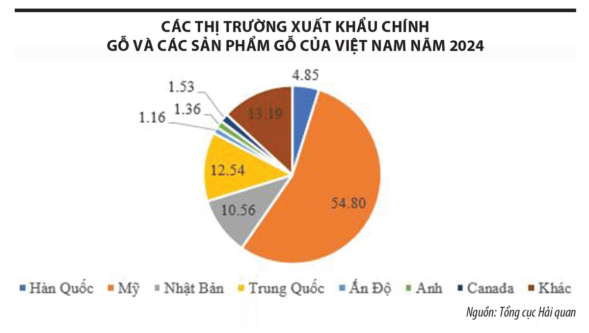 Năm qua, xuất khẩu gỗ và sản phẩm gỗ của Việt Nam đạt 16,25 tỷ USD, ghi nhận kỷ lục mới về xuất khẩu nhóm sản phẩm này. Ba thị trường xuất khẩu lớn nhất, tiếp sau Mỹ là Trung Quốc, với kim ngạch xuất khẩu 2,04 tỷ USD trong năm 2024, chiếm 12,54%; Nhật Bản với kim ngạch 1,72 tỷ USD, chiếm 10,56%. Các thị trường tiếp theo lần lượt là Hàn Quốc, Canada, Anh, Ấn Độ, Hà Lan…, với giá trị xuất khẩu dưới 1 tỷ USD.