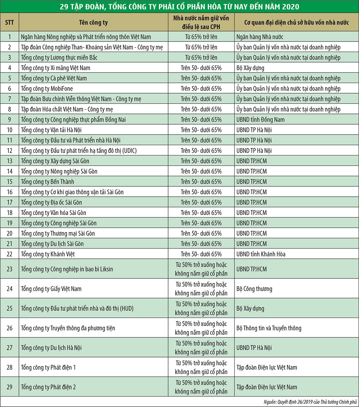 Có tới 29 tập đoàn, tổng công ty do các bộ, tập đoàn kinh tế nhà nước, ủy ban nhân dân cấp tỉnh đang quản lý nằm trong danh mục doanh nghiệp phải cổ phần hóa từ nay đến hết năm 2020 theo Quyết định 26/2019 của Thủ tướng Chính phủ. Tiếc là nhiều “ông lớn” trong số này đang kinh doanh thua lỗ, hoặc lợi nhuận suy giảm trông thấy trong những năm gần đây.