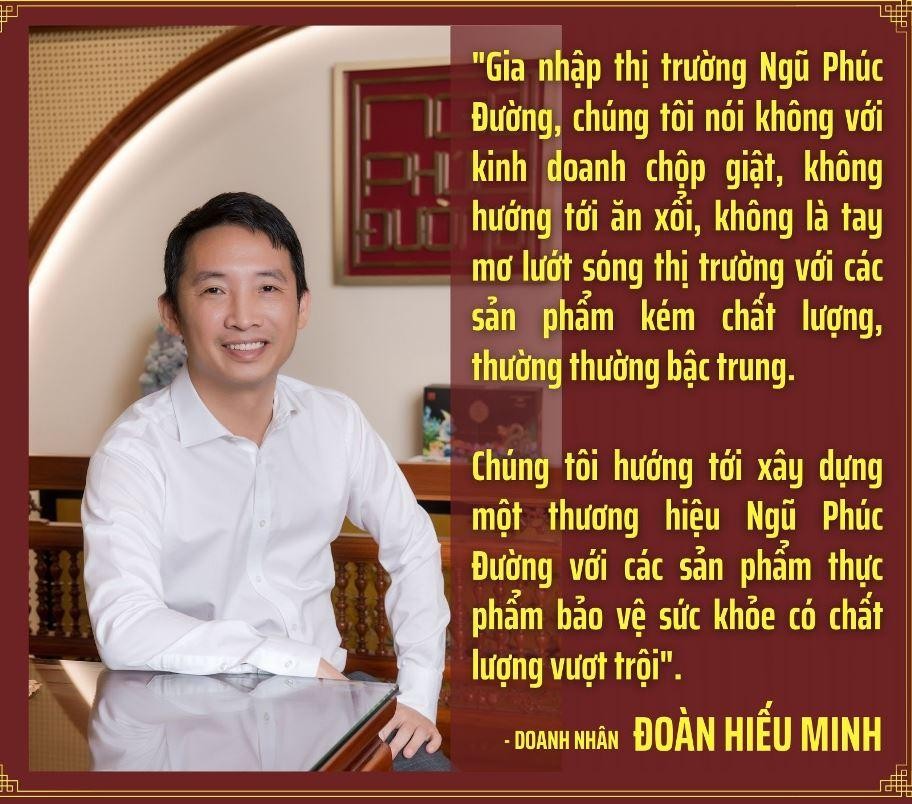 Bỏ lại mác doanh nhân kinh doanh xe dòng sang Rolls-Royce, ông chủ Ngũ Phúc Đường - doanh nhân Đoàn Hiếu Minh đang tràn đầy niềm tin sẽ chiếm lĩnh thị trường thực phẩm bảo vệ sức khỏe trong nước, đem tới cho người dùng các sản phẩm chất lượng cao.