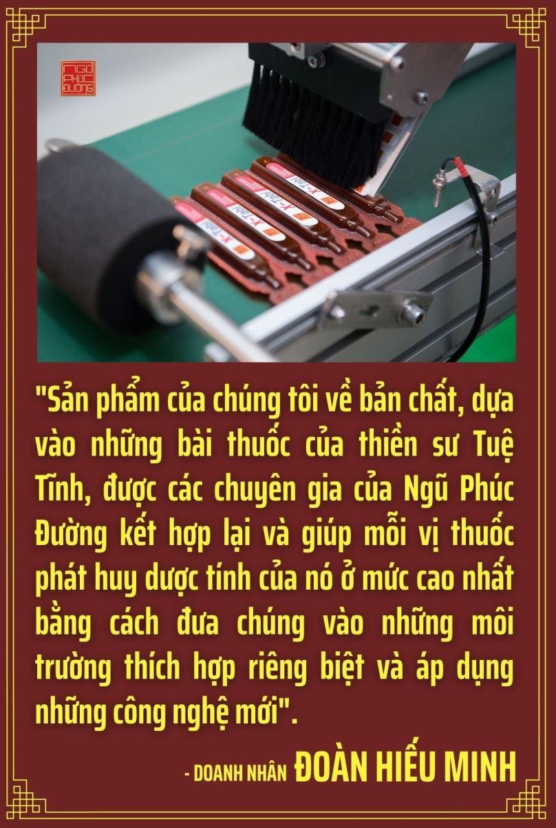Vì thế, Ngũ Phúc Đường ưu tiên thể lỏng hơn, cho dù các công đoạn bào chế phức tạp và khó quản lý hơn. Đổi lại, các thể lỏng, hỗn hợp giúp phát huy nhanh, dễ hấp thụ khi đưa vào cơ thể. Khoảng 50% các sản phẩm của Ngũ Phúc Đường là thể lỏng.