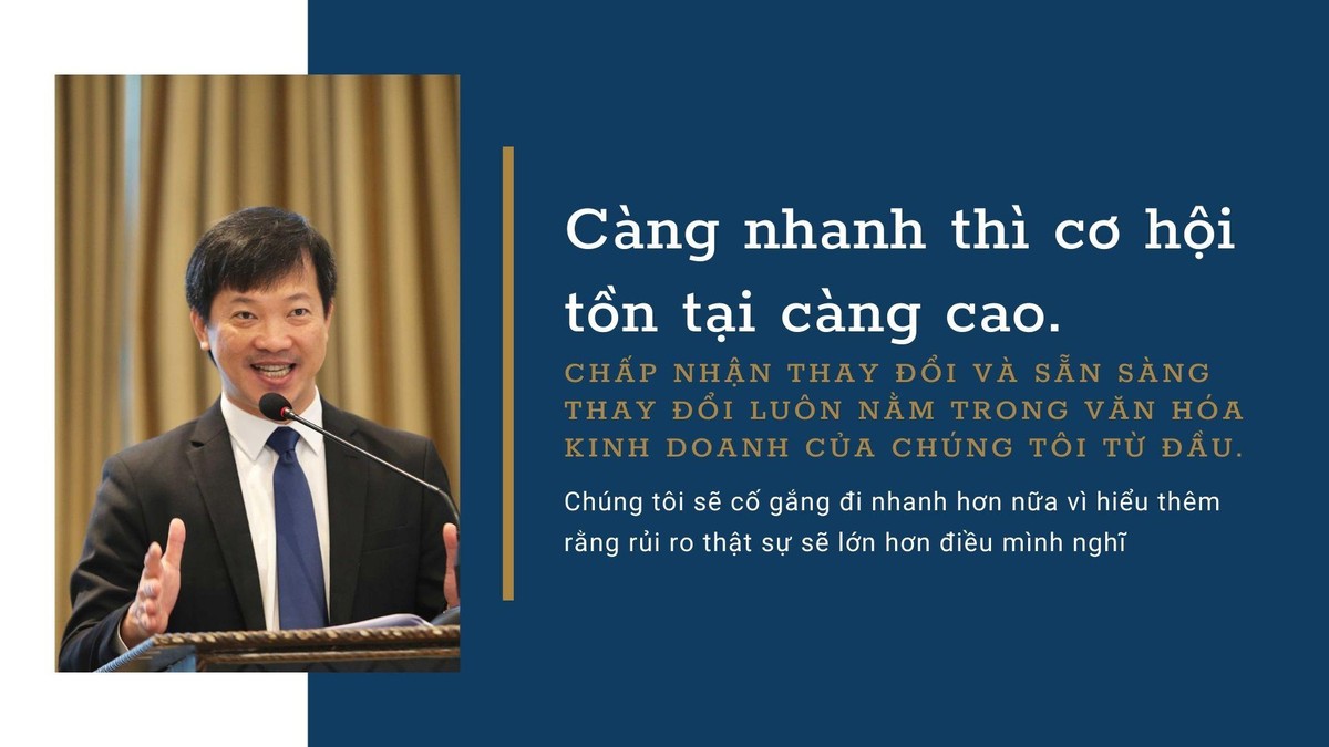 Chúng tôi đã có những chuẩn bị nhất định về tâm lý. Những khiếm khuyết cụ thể xảy ra trong đời thực khi thật sự đối phó với chúng mới gây suy tư. Chấp nhận thay đổi và sẵn sàng thay đổi luôn nằm trong văn hóa kinh doanh của chúng tôi từ đầu. Chúng tôi sẽ cố gắng đi nhanh hơn nữa vì hiểu thêm rằng rủi ro thật sự sẽ lớn hơn điều mình nghĩ. Càng nhanh thì cơ hội tồn tại càng cao.