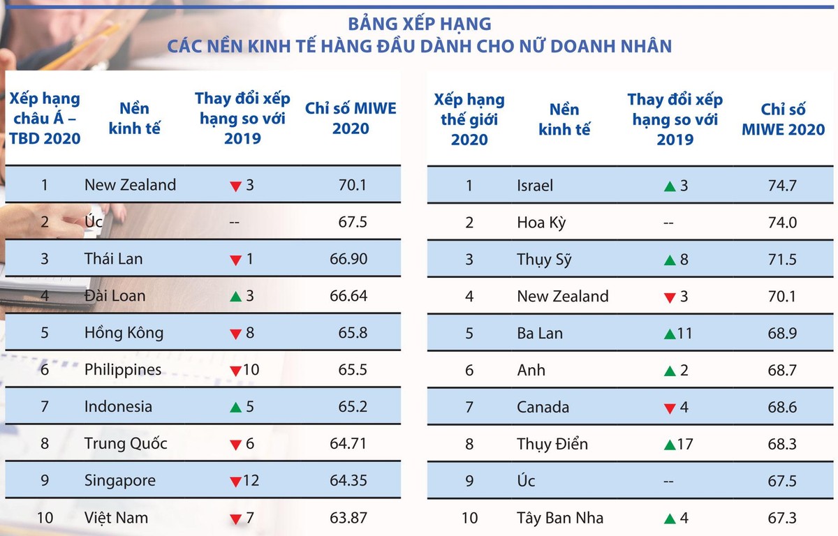 Dựa trên dữ liệu công khai từ Tổ chức Hợp tác và Phát triển Kinh tế (OECD) và Tổ chức Lao động Quốc tế, “Chỉ số Nữ doanh nhân 2020” của Mastercard đã cung cấp bảng xếp hạng toàn cầu về sự tiến bộ của phụ nữ trong kinh doanh trước đại dịch ở 58 nền kinh tế (trong đó có 15 thuộc khu vực châu Á - Thái Bình Dương), chiếm gần 80% lực lượng lao động nữ.