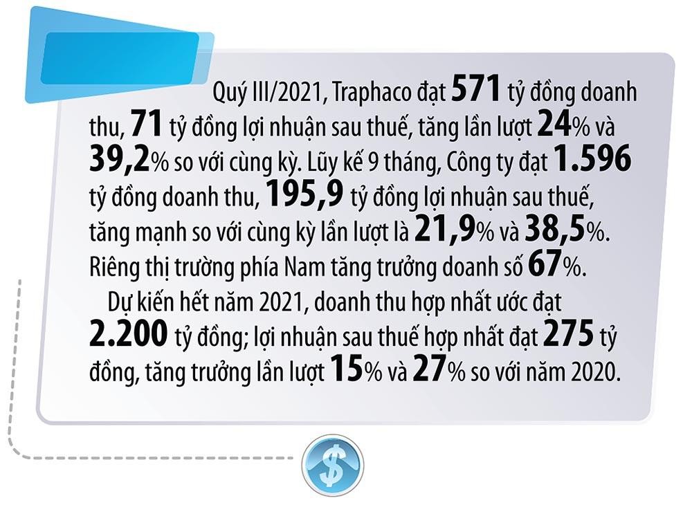 Giới phân tích trên thị trường chứng khoán gọi đây là chiến lược “song mã” và năm 2021 là năm bản lề của Traphaco với mục tiêu được thông qua là doanh thu và lãi sau thuế hợp nhất lần lượt đạt 2.100 tỷ đồng và 240 tỷ đồng, tăng 10% và 11% so với kết quả thực hiện cao của năm 2020. Trong cả giai đoạn 2021 - 2025, mục tiêu tăng trưởng doanh thu và lãi trước thuế đạt tỷ lệ kép được đặt ở mức tương ứng là 13,3% và 15%.
