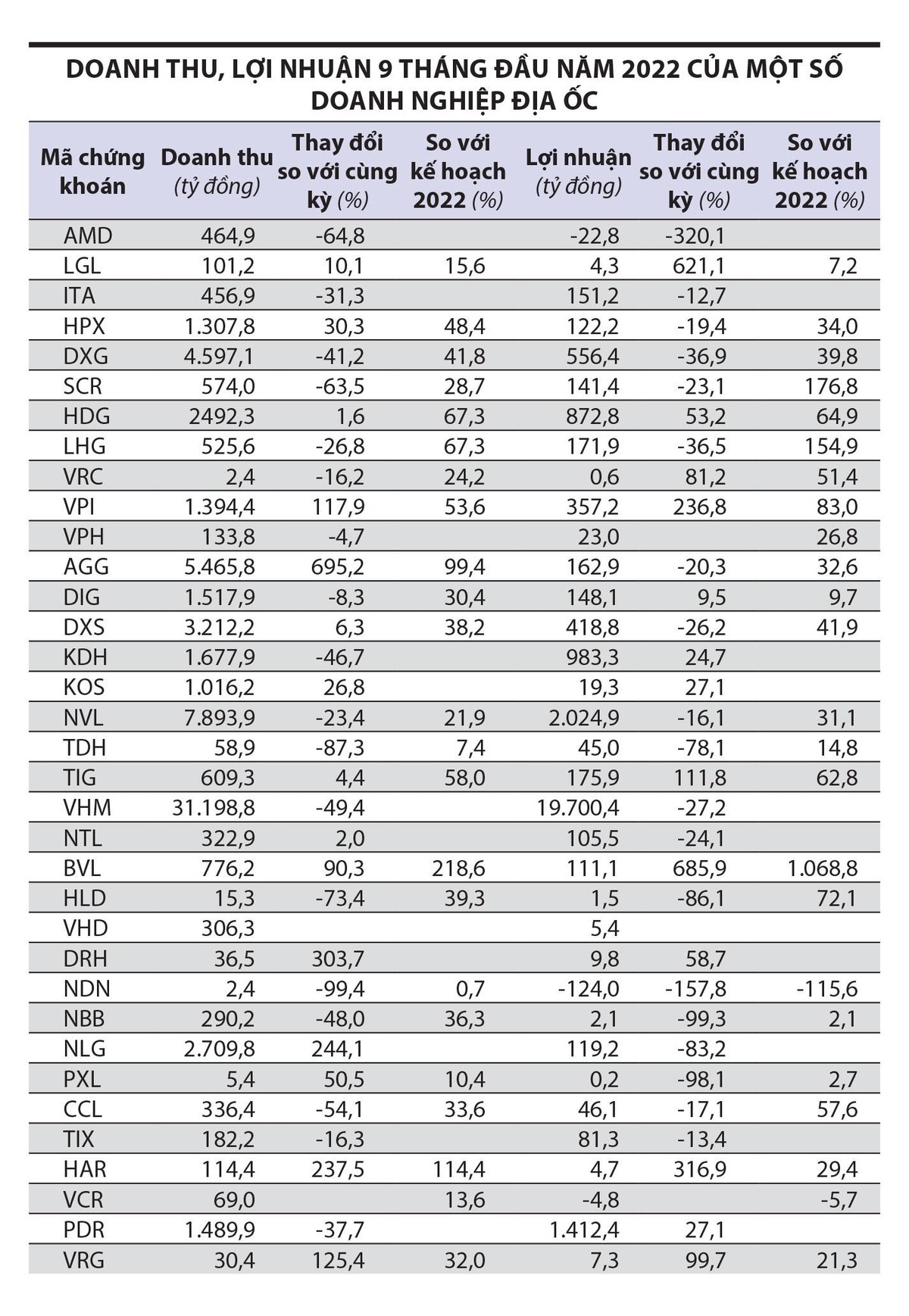 Chẳng hạn, Công ty cổ phần DRH Holdings (mã chứng khoán DRH), chủ đầu tư một số căn hộ cao ốc, nhà phố thương mại tại TP.HCM, Bình Dương như D-Vela Residences, Aurora Residences, Central Garden... ghi nhận lãi 5,1 tỷ đồng trong quý III/2022, gấp hơn 3 lần cùng kỳ năm trước, trong khi tổng doanh thu giảm 95%. Lợi nhuận này đến từ lãi cho vay (6,5 tỷ đồng) mà cùng kỳ năm trước doanh nghiệp không có. Lũy kế 9 tháng đầu năm 2022, DRH Holdings đạt doanh thu 36,5 tỷ đồng và lợi nhuận sau thuế 10,3 tỷ đồng, lần lượt tăng 303% và 65% so với cùng kỳ.