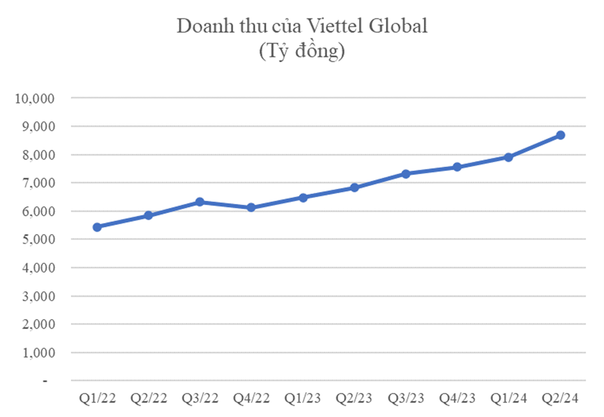 Báo cáo cho thấy, doanh thu bán hàng và cung cấp dịch vụ của Viettel Global đạt gần 8.700 tỷ đồng, tăng 27% so với quý II/2023, cao gấp gần 5 lần so với mức tăng trưởng viễn thông thế giới (6% theo GSMA). Viettel Global ghi nhận 10 quý tăng trưởng liên tục so với cùng kỳ năm 2023. Đây cũng là quý có doanh thu cao nhất từ trước tới nay của Tổng công ty.