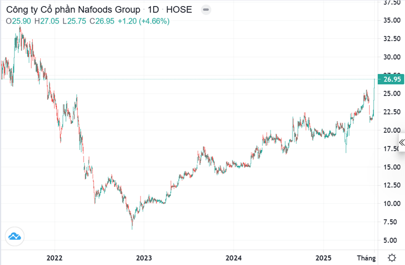 Trên thị trường chứng khoán, cổ phiếu liên tiếp có các phiên tăng giá mạnh kèm thanh khoản ấn tượng trong thời gian gần đây, thể hiện được sự quan tâm của nhà đầu tư với cổ phiếu NAF. Kết thúc phiên giao dịch ngày 01/08/2025, NAF đóng cửa ở mức 26.950 đồng/cổ phiếu, tăng 35% so với đầu năm và tăng gần 60% so với thời điểm thông tin thuế quan của Chính phủ Hoa Kỳ hồi đầu tháng 4. Đây cũng là mức giá cao nhất của cổ phiếu này trong vòng hơn 3 năm trở lại đây, kể từ tháng 11/2021.