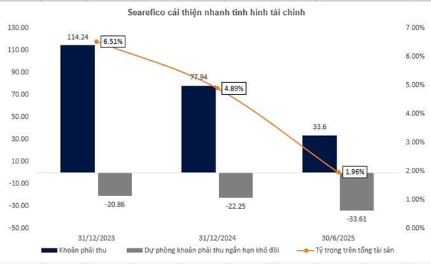 Trong báo cáo hợp nhất của Searefico cũng cho thấy sự thay đổi rõ rệt. Khoản phải thu bị kiểm toán lưu ý đã giảm mạnh, từ mức 114,24 tỷ đồng tại thời điểm 31/12/2023 xuống còn 33,6 tỷ đồng tại thời điểm 30/6/2025, tương ứng mức giảm gần 71%. Cùng với đó, khoản phải trả từng bị nêu ý kiến ngoại trừ đã được xử lý dứt điểm, không còn tồn tại trong kỳ báo cáo.