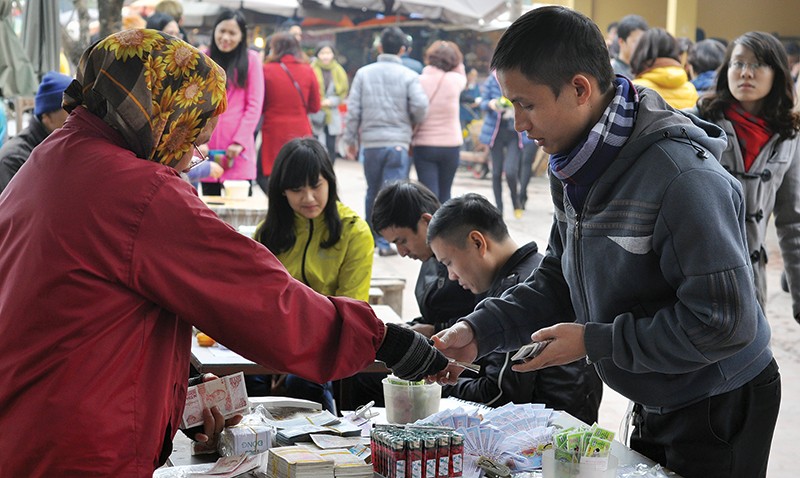 Các quầy bán vật phẩm cầu may ngày Tết cũng thường có dịch vụ đổi tiền lẻ