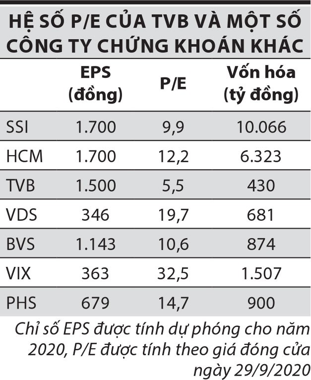 Lợi nhuận trên mỗi cổ phần (EPS) ước tính năm 2020 của TVB là 1.500 đồng, xếp sau SSI và HSC (1.700 đồng), nhưng cao hơn hẳn so với VDS (dự kiến 346 đồng), BVS (dự kiến 1.143 đồng), VIX (dự kiến 363 đồng), PHS (dự kiến 679 đồng)...