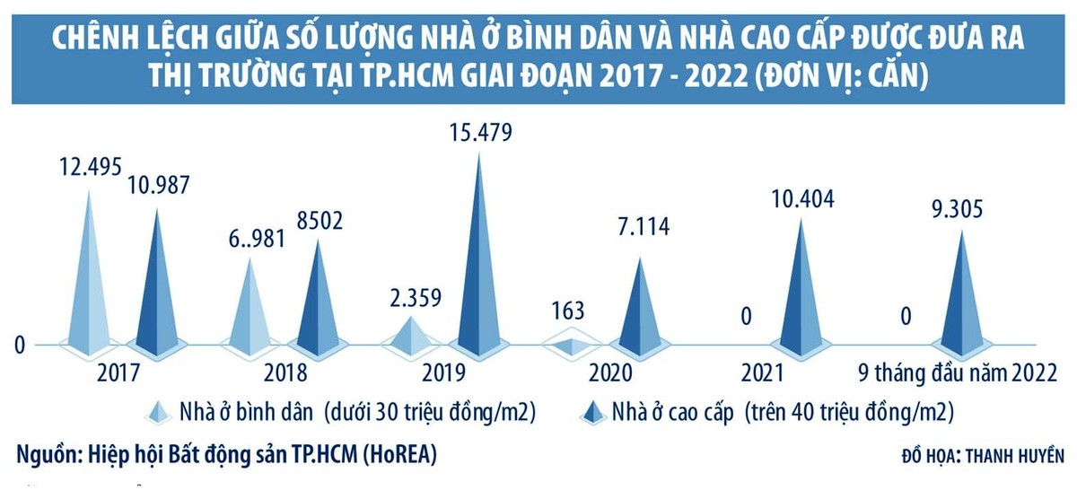 Dòng sản phẩm nhà ở bình dân phù hợp với túi tiền và nhu cầu thực ở TP.HCM có Chỉ số Giá nhà cao gấp hơn 20 lần so với thu nhập trung bình của xã hội (trong khi chỉ số này ở các nước phát triển chỉ cao hơn 6 - 7 lần) đã cho thấy, phân khúc này không dành cho dân thường và gần 2 năm qua cũng không có căn nào được xây mới. Trong khi đó, nhà ở tầm trung, đặc biệt là dòng cao cấp lại bùng nổ nguồn cung.