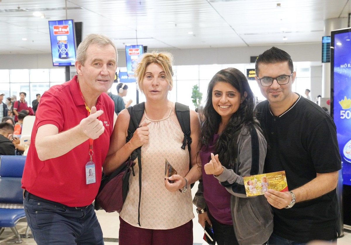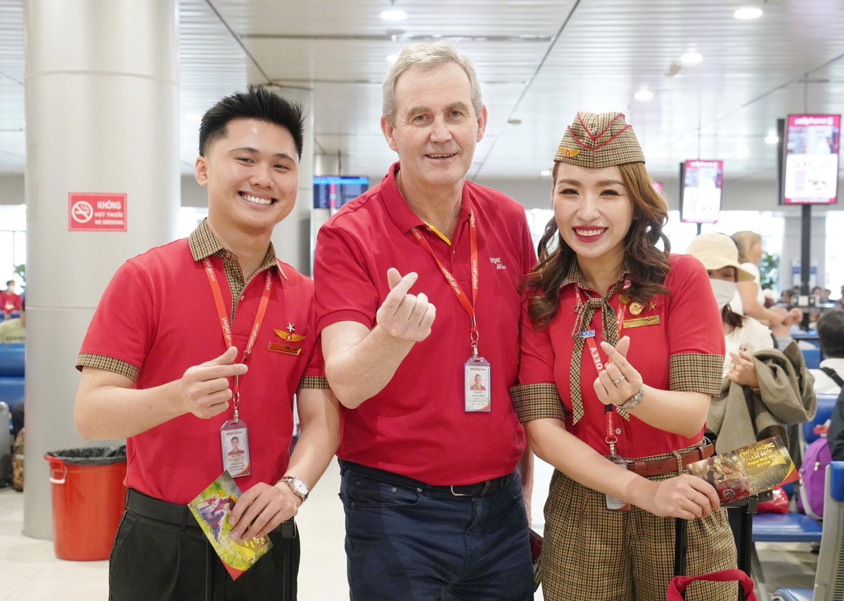 Phó Tổng giám đốc Vietjet Michael Hickey (áo đỏ) chúc mừng năm mới hành khách tại sân bay Tân Sơn Nhất (TP. Hồ Chí Minh) |