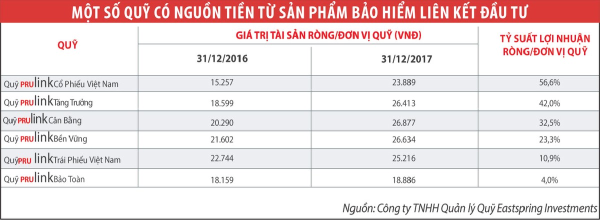 TTCK khởi sắc đã giúp các quỹ đầu tư từ nguồn bảo phí tăng trưởng rất tốt. Năm 2017, tỷ suất lợi nhuận ròng của Quỹ Prulink Cổ phiếu là 56,6%; Quỹ Prulink Tăng trưởng là 42%, Quỹ có tỷ suất thấp nhất là Prulink Trái phiếu cũng tăng trưởng 10,9% (xem bảng).