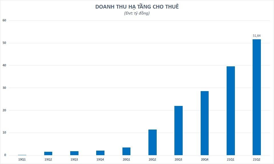Dù mới triển khai nhưng doanh thu năm 2020 của mảng này đạt hơn 65 tỷ đồng, gấp 7,6 lần năm trước đó. Năm 2021, Viettel Construction đặt mục tiêu đạt doanh thu 300 tỷ đồng từ hạ tầng cho thuê. Sau 6 tháng đầu năm, doanh thu mảng này ghi nhận tăng trưởng đột biến 516% so với cùng kỳ, đạt 91,2 tỷ đồng qua đó hoàn thành 45,6% kế hoạch cả năm.