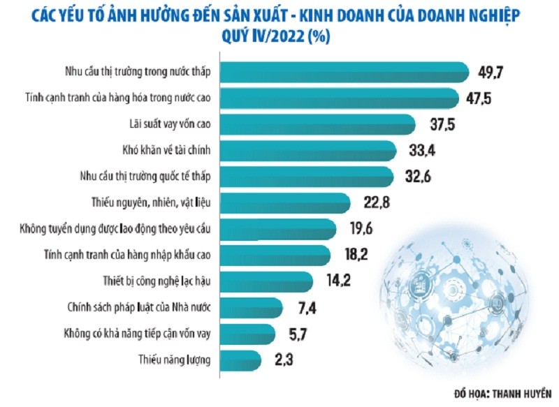 Tiêu dùng nội địa đang gặp khó khi tình hình sản xuất - kinh doanh của doanh nghiệp khó khăn. Theo ông Hiếu, một số khảo sát về khó khăn mà doanh nghiệp đang đối mặt cho thấy, nhu cầu thị trường trong nước thấp đang là khó khăn hàng đầu, có tới 49,7% doanh nghiệp tham gia khảo sát lựa chọn; trong khi khó khăn về lãi suất tăng cao có 37,5% doanh nghiệp lựa chọn…